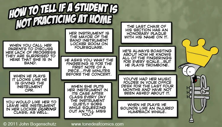 3. Quality over quantity. An hour of solid, targeted, and focused practice is way more valuable than hours of scales played while watching tv or spacing out. Have students keep a practice journal as to how much they practice, how well they focused, and what improved (or didn't). Using a timer can be really helpful to keep on target, whether it's a 10 minute mini-practice session or a 30 minute targeted session.